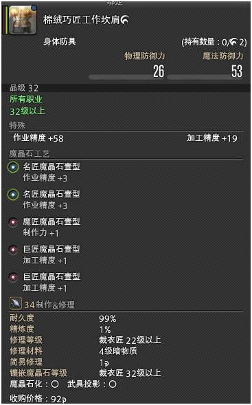 特定材质的装备,只能由特定的生产职业来镶嵌。比如,由布料制作的装备,只能由裁衣匠来镶嵌,而金属板甲之类的,则要交给铸甲匠。