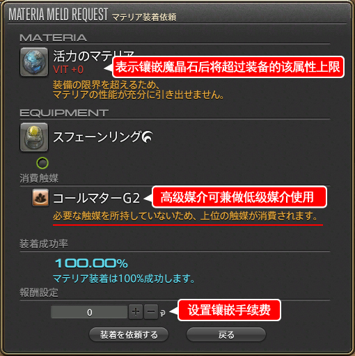 镶嵌的玩家的生产职业等级必须高于装备等级,镶嵌时需要消耗媒介碳化暗物质和魔晶石,如果镶嵌失败,媒介和魔晶石会消失,装备会保留下来。当玩家输入/lookingformeld或/lfm命令时,可将在线状态设置为接受镶嵌,名字前方会出现此标志
